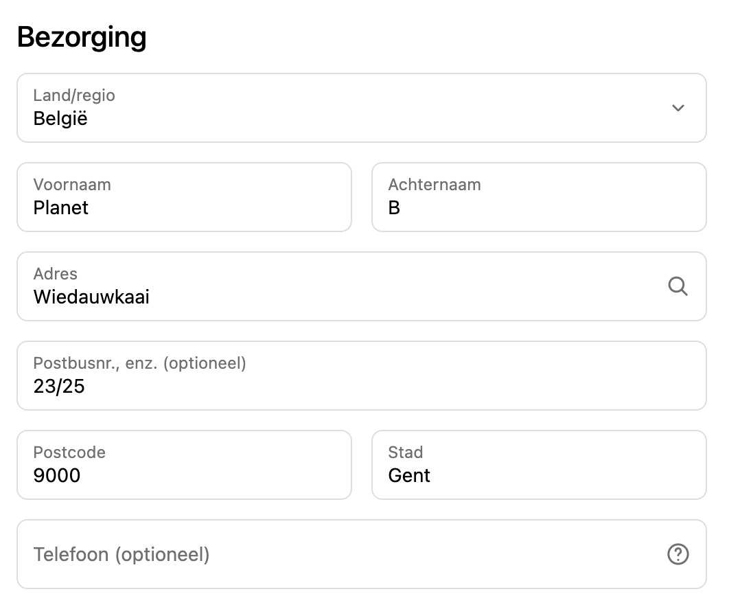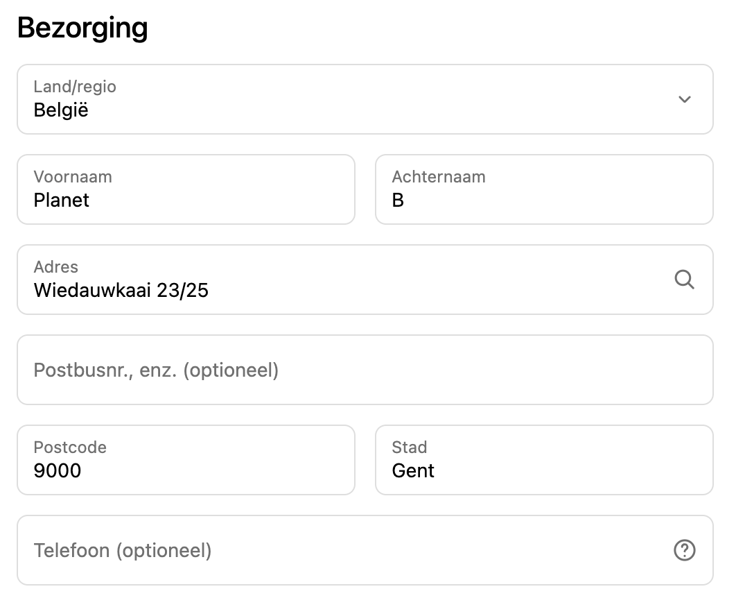 Veld 2 (Busnummer / Toevoeging): Dit vakje is optioneel. Heb je geen busnummer? Laat dit veld dan helemaal leeg.
